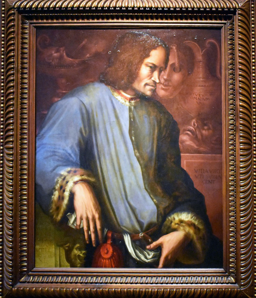 Behind Lorenzo, Vasari, who was exceedingly fond of allegorical symbols, as demonstrated in his Portrait of Alessandro de’Medici, above, has inserted a multitude of strange objects, including masks, vases, an oil lamp, and a pillar. An ancient oil lamp in the guise of a mask is to the left of Lorenzo. According to Vasari, oil falls from the mask’s horns onto its forehead to fuel the wick of the lamp, sticking out of the mask’s open mouth. Its significance is also explained by Vasari: just as the wick lights the world around it, Lorenzo lights the path for his descendants to follow. To the right of Lorenzo, the inscription on the pillar reads, “vitia virtuti subiacent” (“Virtue triumphs over vices”). The personification of Virtue is the vase, on which is inscribed, “virtutum omnium vas” (“the vase of all virtues”). On the spout of the “vase of all virtues” hangs a mask, which Vasari called “the reward of all virtues.” In opposition lays Vice, personified by the monstrous mask on the pillar behind the vase. All of the allegories are captured in the inscription on the pillar against which Lorenzo leans: “sicut maiores mihi ita et ego posteris mea virtute praeluxi” (“As my ancestors did with me, I too, with my virtue, shall light the way for my descendants”).