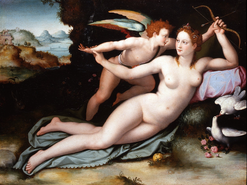 The work was meant to be an explicitly sexual scene, as demonstrated by Venus’ nudity and the presence of the satyr and grapes, both symbols associated with Bacchus and unbridled sexual desire. Some scholars believe that the two cupids are actually Eros (god of physical love/desire) and Anteros (god of requited love/spiritual love). Read in this way, the painting becomes a battle scene between Eros, whose passion was uncontrolled and slightly menacing as demonstrated by Venus’ attempt to cover herself while the satyr seeks to pull the cloth away, and Anteros, who controls passion by holding onto the satyr’s horns.