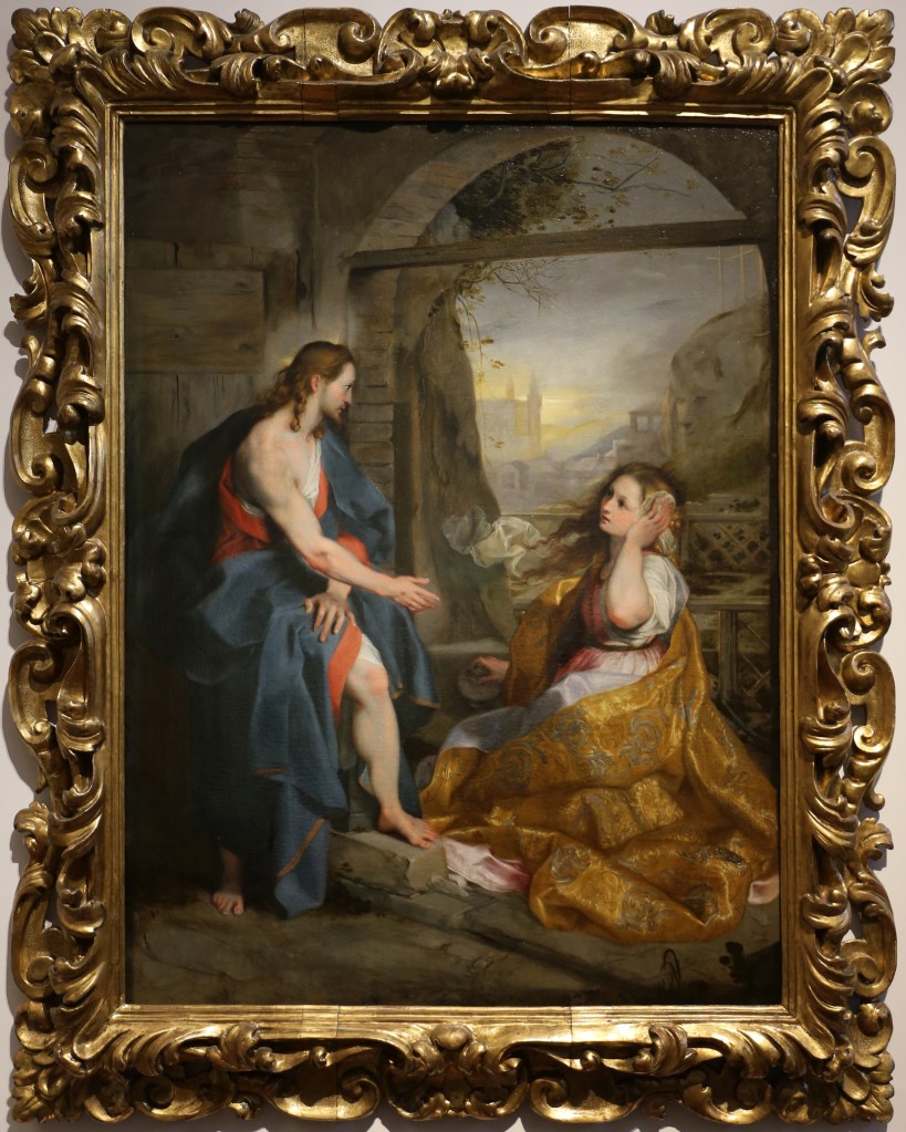 Lavinia’s work depicts what was once a common theme in Catholic art; in fact, it is one of two pieces in this very room entitled Noli me Tangere. The theme is a depiction of Mary Magdalen’s first encounter with the resurrected Jesus Christ, as narrated in the Gospel according to John: