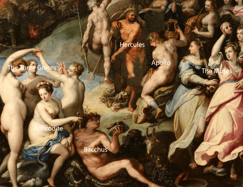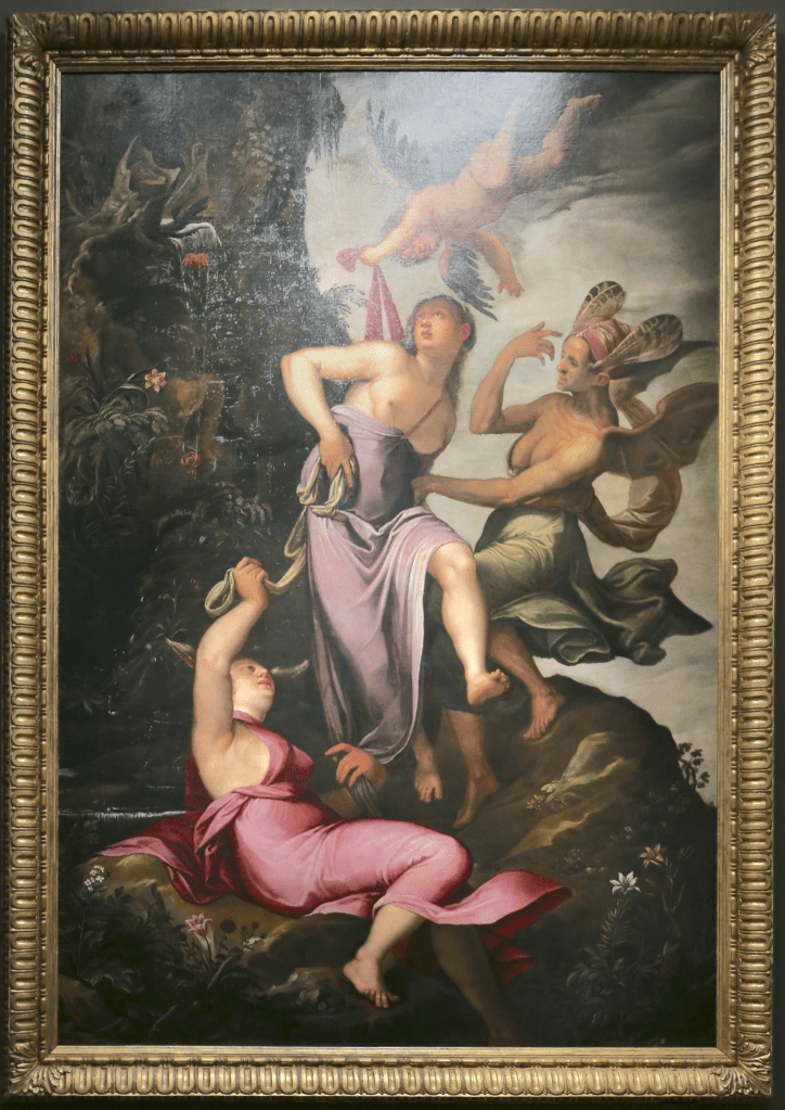 Eros and Anteros, as their names imply, represent the opposite aspects of love, Anteros is lawful love or requited love while Eros is love without law. In other words, Eros represents bodily passion and Anteros represents divine love, a theme taken up by Titian in his work known as Sacred and Profane Love held in the Galleria Borghese in Rome. Both Eros and Anteros were the sons of Venus and Mars, so it is unclear why Mercury is depicted here. Due to the fact that Jupiter is cut off at the waist, some scholars believe that this canvas was at one time part of a larger work. In other words, this work has had scholars puzzled for quite some time, and no one can agree on its meaning.