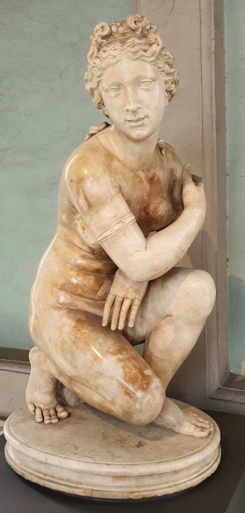 Like the Louvre and its marble version of the Silenus with Bacchus statue, the Uffizi also houses multiple ancient Roman marble copies of Greek bronze originals. Few Greek bronze originals have survived to us because bronze is such a versatile metal and many times bronze works of art were melted down for use of the bronze elsewhere. Luckily, Romans loved making marble copies of the Greek originals, and these marbles have survived in much greater numbers. One such Roman copy of an original Greek bronze is the Uffizi’s copy of the so-called Crouching Venus (1st century AD), a copy of a Greek bronze produced, according to Pliny the Elder, by the Greek sculptor Daedalsas. (Her head, however, is the result of a restoration).