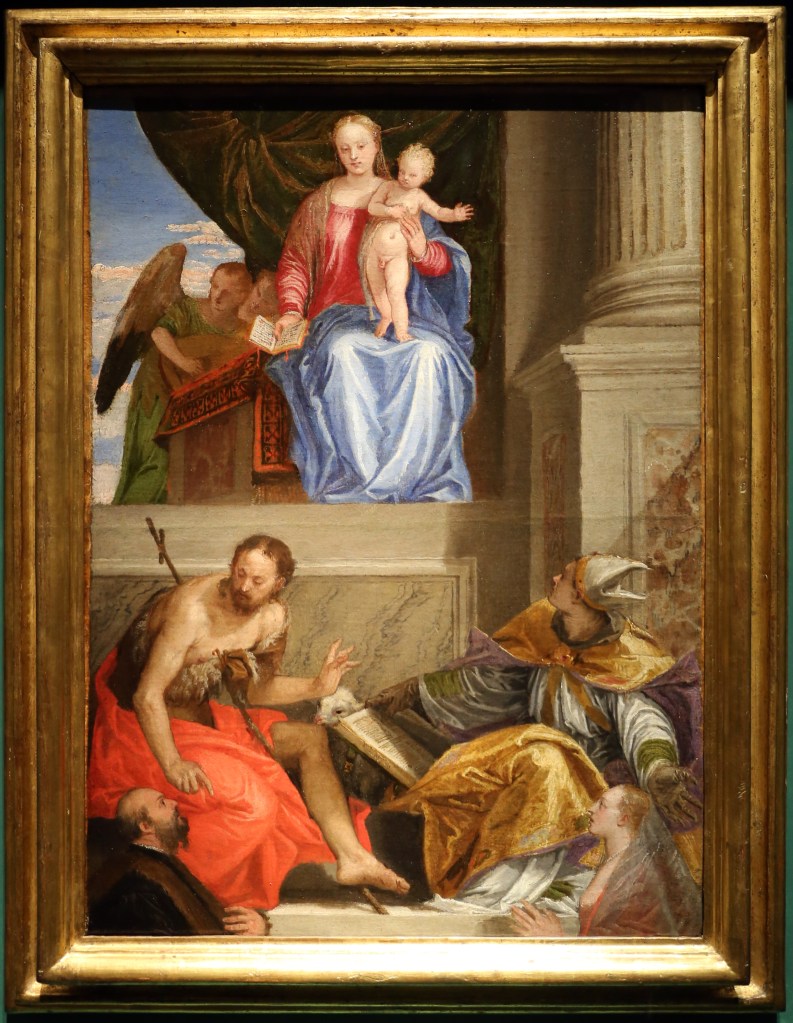 Veronese’s work extends the ledge that the Virgin is enthroned upon to completely separate her space from that of the saints and the donors, setting her even more “on a pedestal.” The saints depicted in Veronese’s work are John the Baptist, identifiable via his hair shirt and processional cross, and St. Louis of Toulouse, dressed in his bishop vestments. The altarpiece for which is work is the model was unfortunately extensively damaged, and therefore differences between the two are visible.