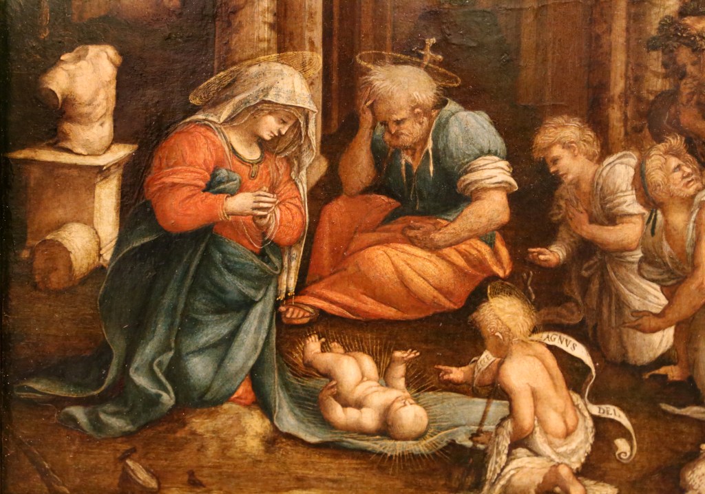 Catherine’s martyr’s palm is just visible above her left shoulder. St. John the Baptist is shown kissing the Christ-child’s foot while holding his traditional attribute of a processional cross. Like the children in the da Porto portraits, the boy St. John is depicted with such tenderness that his innocence and childlike naivety is clearly visible, emphasized by St. Joseph’s hand on St. John’s shoulder. St. Joseph was, after all, St. John’s uncle and thus an important father figure in his life.