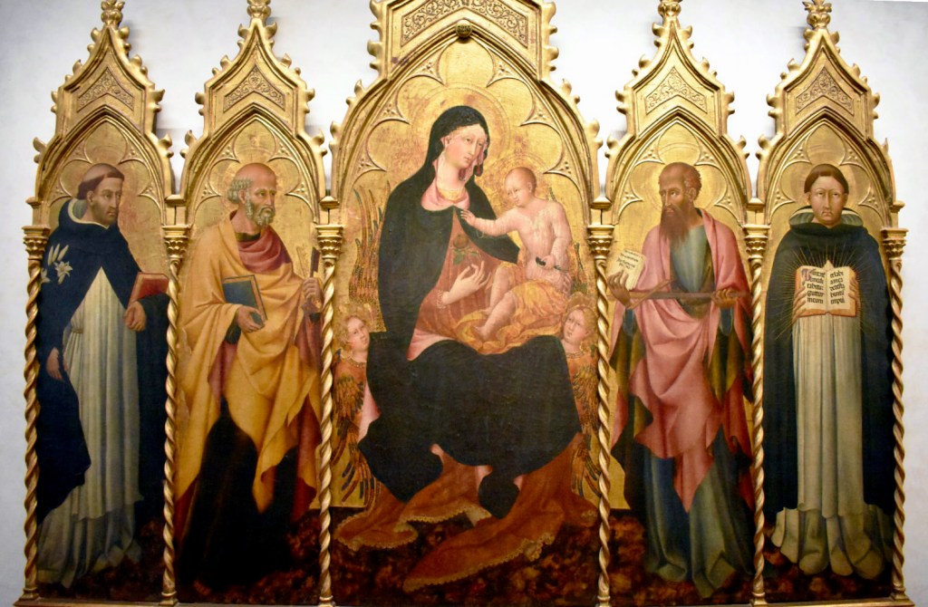The first room in this series, Hall 19, is filled with pieces by Sienese artists. The first, Giovanni di Paolo, painted the Guelfi Altarpiece in 1445 for the Guelfi Chapel in the Church of San Domenico in Siena, also known as the Basilica Cateriniana, pictured below.