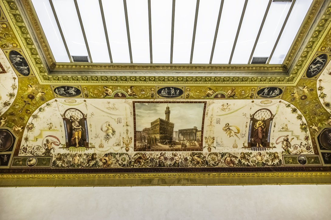 During the late 16th century, the ceiling in Room 20 was repainted to showcase Florentine landmarks, including the Palazzo Vecchio.