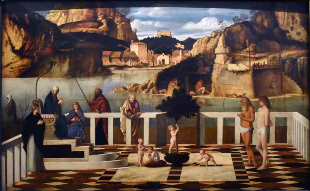Another “heavy hitter” of Venice, Giovanni Bellini, known as Giambellino, painted what is known as the Sacred Allegory (sometime between 1487 and 1504). It is considered one of Bellini’s most enigmatic pieces. The shape of the painting suggests that it was meant for a palazzo for private consumption. Some scholars believe it was the painting requested by Isabella d”este for her studiolo in Mantua.