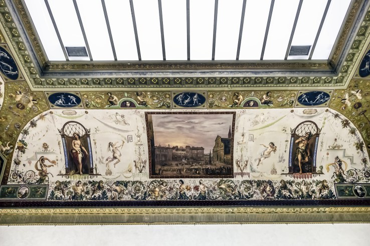 Originally, these rooms housed the Medici Armory. Thus, some of the decorations on the ceiling are of armor and battle scenes. Sadly, some of the ceiling in Room 21 was damaged during German bombing in World War II in 1944. To commemorate this event, a new design was placed on the ceiling that had been destroyed which depicts the bombing of Florence.