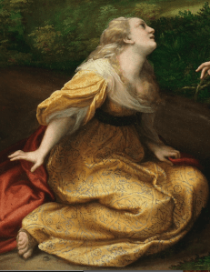 Jupiter grew up under the care of a goat (in some stories a nymph) named Amalthea. In honor of her foster care, Jupiter placed her image among the stars as the constellation capricorn (again, an allusion to Cosimo I). As foretold, Jupiter usurped his father and defeated the titans and giants, establishing a “peaceful” new world. (Judging by the later myths, however, I wouldn’t necessarily describe the new order as “peaceful”).