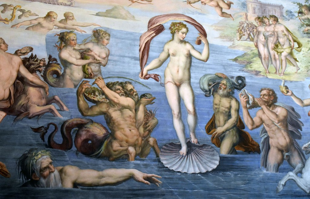 Dosso, however, does not copy Raphael’s composition categorically. Instead, he employs his typical Venetian color scheme, characterized by deep, rich colors as opposed to those bright/pure used by Raphael and his Roman counterparts.