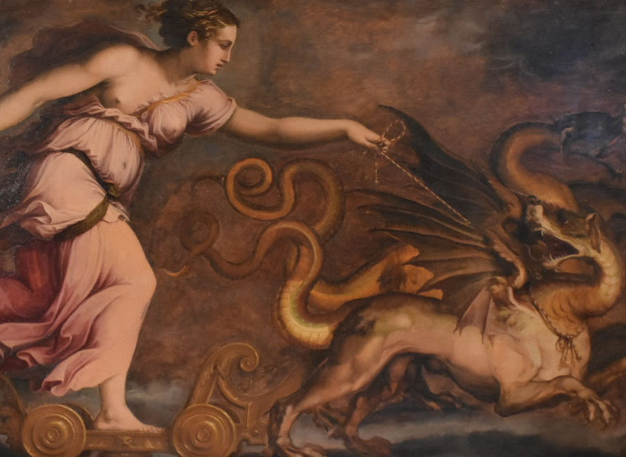 Giovanni Francesco Luteri, known as Dosso Dossi, worked for Duke Alfonso I d’Este of Ferrara and subsequently the Duke’s son Ercole II. His brother, Battista, was also a painter and was referred to as Battista del Dosso (Battista from Dosso) or Battista Dossi. “Dosso” was likely a small family property, hence why it was applied to both brothers. Eighteenth century historians, however, erroneously concluded that Dosso was the family’s last name, hence the double “Dosso Dossi.”