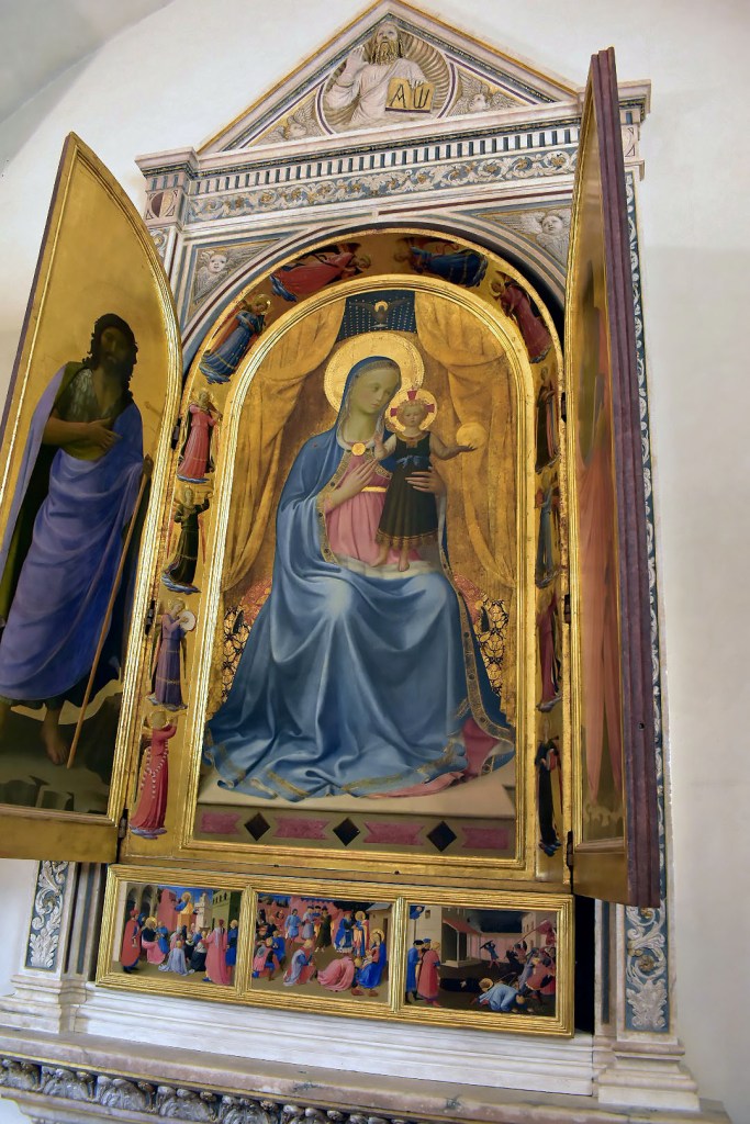 On the right of the work is St. John the Baptist, identifiable via his cross-staff and his hermit’s robe, and on the left of the work is St. John the Evangelist, holding his own Gospel and a golden chalice with a serpent rising up, symbolizing Christianity’s triumph over death. The chalice alludes to a legend of St. John the Evangelist, wherein a poisoned cup was given to him, but he drank it without coming to any harm due to his faith.