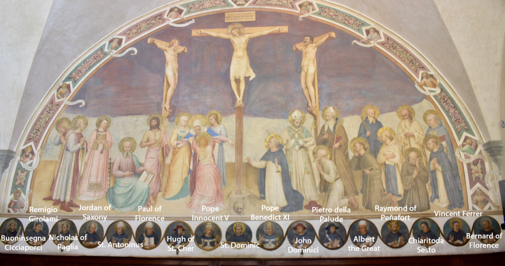In his Predella with the Life of St. Achatius, Bacchiacca depicts three scenes from St. Achatius’ life: 1. Achatius defeating the rebel host; 2. Baptism of Achatius and his men; 3. Martyrdom of the Ten Thousand. The legend of St. Achatius is first referenced is in the Catalogus Sanctorum of Petrus de Natalibus, written around 1370-1400. The legend told of a Roman commander, St. Achatius, who was dispatched with nine thousand Roman soldiers against a rebel host that vastly outnumbered them. The night before the battle, an angel appeared to Achatius and his men, telling them if they were to convert to Christianity, then they would defeat the rebel host. The Roman soldiers took the message to heart and converted to the new faith, and thereafter defeating the host the next day. The Roman Emperor, however, later hears about the conversion and leads an army against Achatius and his now Christian army. Although no battle occurs, the Achatius’ men refuse to recant their new faith so the Emperor determines he will torture them. Yet, he cannot. Stones bounce off the men without doing any harm; the whips that were meant to flog them are dashed to the ground. Seeing these miracles, one of the emperor’s other commanders, Theodorus, switches sides and joins Achatius, bringing with him a thousand of his own men, bolstering the Christian army to ten thousand men. The Christians are then crowned with thorns, in mockery of Christ’s own passion, and baptized in their own blood before being led to Mt. Ararat and crucified.