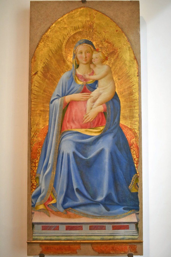 St. Anthony, on the other hand, is identifiable via his traditional attribute of the white lily, which symbolized his purity. (White lilies were also associated with the Virgin for the same reason). Whereas the red roses at the base of the pedestal reference the Virgin, who is known as “a rose without thorns,” an epithet which is itself an allusion (to the garden of eden where roses grew without thorns).