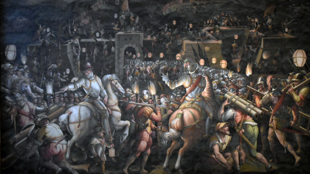 Interestingly, those drowning in the Red Sea (in the fresco on the right) are not Egyptians, but Ottomans. The symbolism would not be lost on contemporary Florentines: Cosimo I is the “new” Moses, leading his people out of reach of the Ottomans and towards safety.