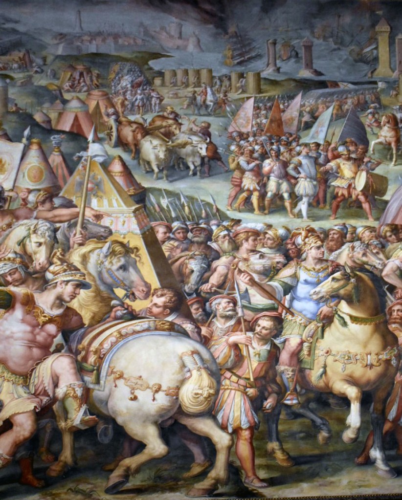 The first, Sala delle Sabine, depicts the Sabine Hersilia, wife of Romulus, the founder of Rome, throwing herself between the Romans and the Sabines. According to legend, the Romans kidnapped women from the neighboring tribe, as apparently they were lacking females within their own city. Understandably outraged, the fathers of the women proceeded to attack the Romans. Caught in the middle, the Sabine women intervened between their now-husbands and their fathers, persuading each side to lay down their arms. Such decorations allude to the Duchess’ supposed talent as a mediator.