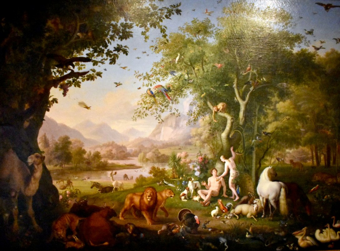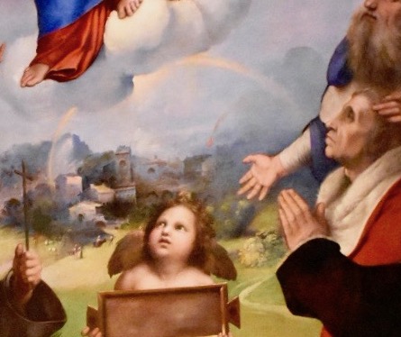 The cypruses in the background harken to the Garden of Eden. Baldovinetti is credited with introducing attention to landscapes to Florentine art, which is clear here in the lush landscape he created for this painting. Giorgio Vasari, artist and art critic, wrote of Baldovinetti, “He took much delight in making landscapes, copying them from the life of nature exactly as they are; wherefore there are seen in his pictures streams, bridges, rocks, herbs, fruits, roads, fields, cities, castles, sand, and an infinity of other things of the kind.” Giorgio Vasari. Lives of the Most Excellent Painters, Sculptors and Architects. Stadium Publishing, 2018.