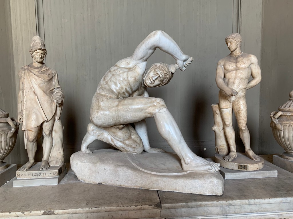 The Medici Venus was allegedly found near the Trajan Baths, in Rome. The statue is a 1st century B.C. marble copy of a Greek bronze. Traces of the paint that once adorned the marble can still be detected. Although many people think of Greek and Roman statues as quintessentially white, they were actually painted with highly pigmented colors, which were rubbed off over the thousands of years spent combating the elements. The Medici Venus is no exception. For a riveting commentary on the Medici Venus and the nude as depicted in art in general, watch Mary Beard’s two-part series, The Shock of the Nude.